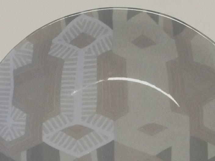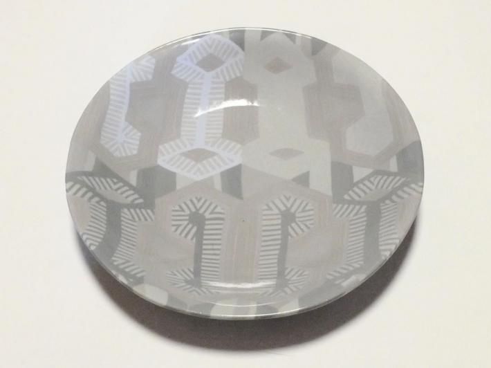 10年以上前にゼンマイをモチーフにした練り上げ中皿がありましたが、今回はワラビがプラスされました。以前のゼンマイ中皿は背景が白でコントラストが明確でしたが、今回は全色の明度彩度が極めて近く、こんな配色で練り上げ模様を組むのはハラダマホくらいじゃないか?そのくらいユニークな色合いをしています。練り上げを組んで二十数年、ハラダさんの練り上げ作品の中でも変わった作風が際立っています。灰茶色の背景が酸化焼成の絵唐津みたいな色味で、鉄絵具でワラビを見込みに描いた絵唐津の皿がありますが、それを制作のヒントにしたのかな?とも思いました。以前、石黒宗麿の絵付けをなんとか練り上げに翻案できないか?と奮闘している時期もありました(『干柿』のパスタ皿や『田にカラス』の豆皿など)。