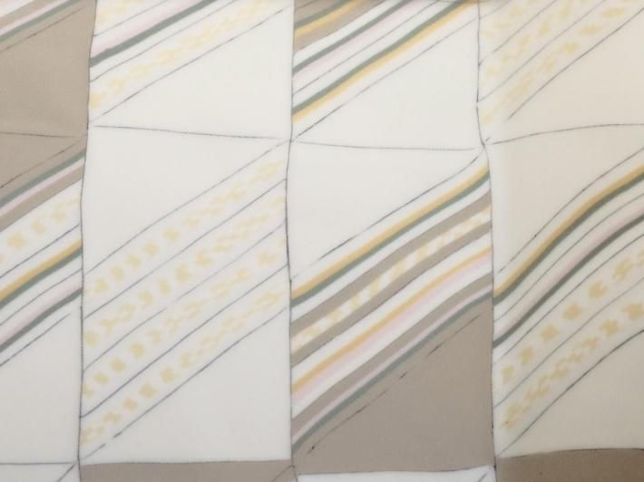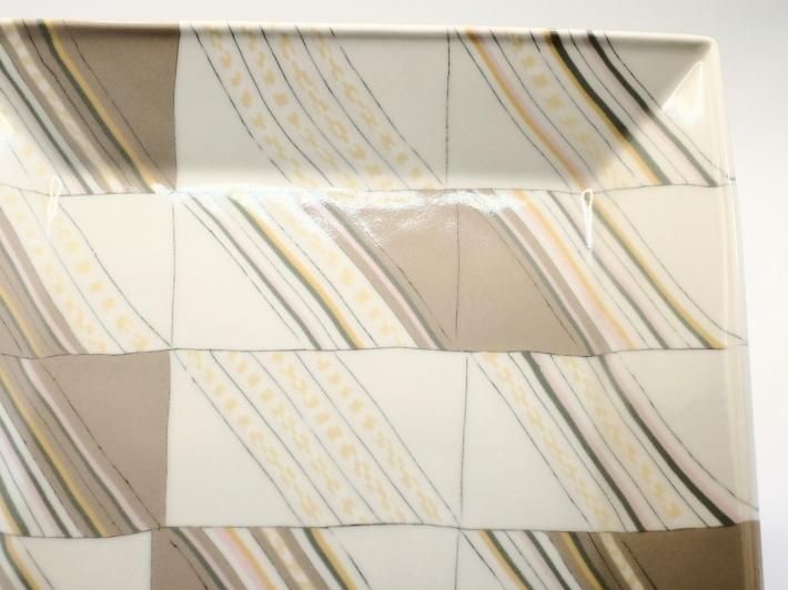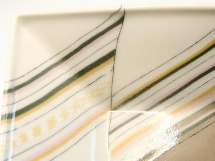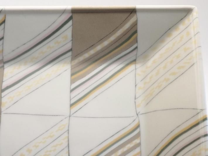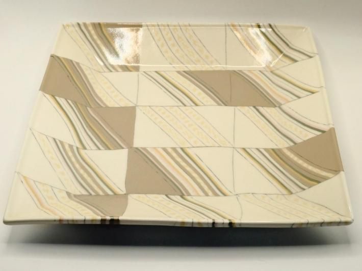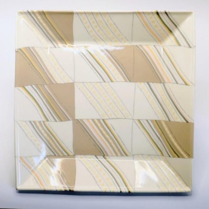 この練り上げ大皿のモチーフは具象なのか?抽象なのか?正体を明かすとサンドウィッチ(色の帯はそれぞれハム、チーズ、タマゴなどで白はパン)なのです。たしかにサンドウィッチの断面は練り上げ模様に見えないこともない。してみるとハラダさんの作品の中ではかなり具象的な練り上げと言えましょう。モンドリアンの『ブロードウェイブギウギ』は黄色と赤、青の矩形で構成された抽象画ですが、ニューヨークの目抜き通りを高層ビル最上階から画家が俯瞰で眺めた、そのときの景色がアイデアの元だったそうです。してみると具象と抽象は意外と近いところにあるのかもしれません。