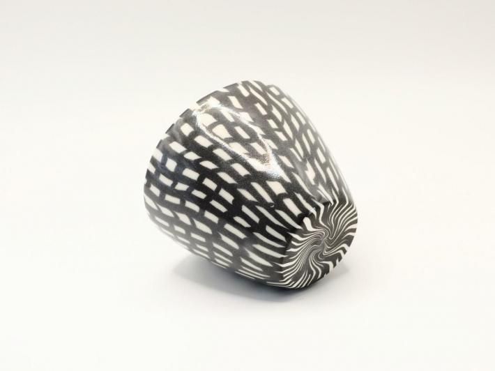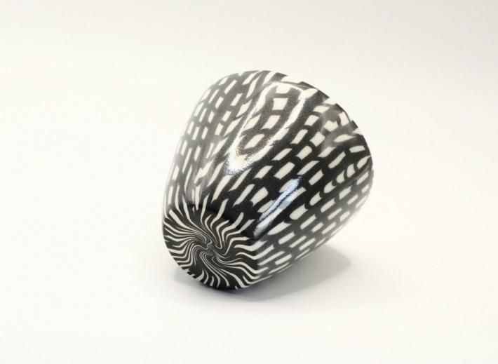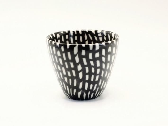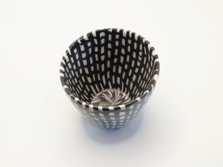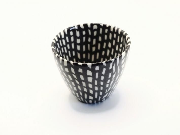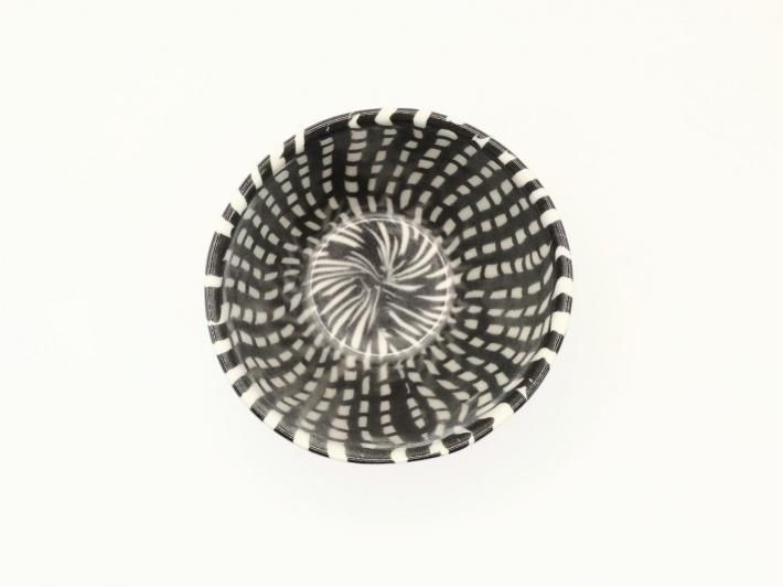 『白樺』はハラダさんの作歴の中でも長いあいだ変わらず作り続けている、特別な意味のある練り上げ模様といえます。「長いあいだ変わらず」と言いましたが、その時々によって白い破線の表情が違います(白樺は色もパターンもシンプルなので、違うといえば白い破線しかないのですが……)。白と黒の色土を組合せて数ヶ月寝かせ、互いの土を馴染ませるために押して叩くのですが、ハラダさんはそれを「潰す」と言います。潰しの工程で白い破線の表情がいろいろ変わります、陶土が含む水分量だったりハラダさんの力の入れ具合だったり。理想の『白樺像』が作者にあるのか?聞いたことはありませんが、初期に比べて最近のほうが面白くて表情豊かな破線の発生率が上がっています(個人の感想です)。